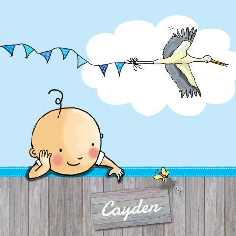 Lief geboortekaartje voor baby met ooievaar en hout